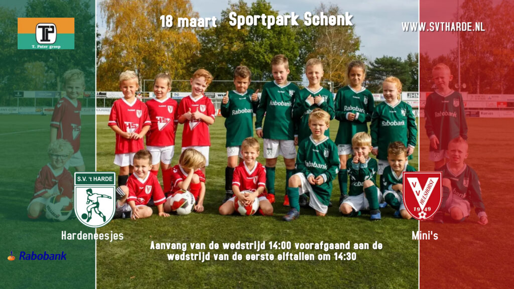 Zaterdag 18 maart staat om 14:00 uur de returnwedstrijd van de Hardeneesjes van S.V. ’t Harde tegen de Mini’s van V.V. Hulshorst op het programma voorafgaand aan de wedstrijd van de eerste elftallen. Een aantal maanden geleden werd er door de Hardeneesjes een felle wedstrijd uitgevochten tegen de Mini’s van Hulshorst. Na deze fanatieke felle strijd gezamenlijk om half drie het veld op met het 1e en aansluitend patat eten en ranja drinken in de kantine. Dit programma is goed bevallen dus we gaan de uitdaging tegen Hulshorst weer aan. Het zou wederom geweldig leuk zijn als alle ouders, opa’s en oma’s van de spelertjes en alle andere belangstellenden komen kijken om de jeugdige talenten aan het werk te zien, die over ongeveer 15 jaar het 1e elftal zullen gaan vormen van beide verenigingen.