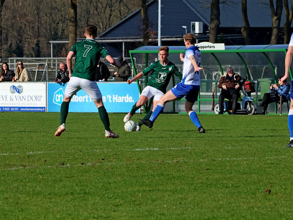 Net als vorige week sloeg S.V. ’t Harde weer toe in de slotfase. In de blessure tijd was het “good-old” Henkie Elskamp die vanuit een ingooi de bal op de paal wist te schieten, vanuit de rebound scoorde Dennis van Hulsteijn de winnende treffer. Sportpark Schenk ontplofte, want de ontlading was groot. De goed leidende scheidsrechter Van de Beld liet nog 5 minuten doorspelen en floot uiteindelijk de wedstrijd af.