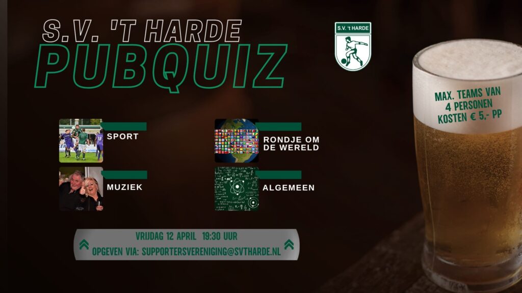 Op vrijdagavond 12 april organiseert de supportersvereniging weer de Grote Pubquiz. De kantine is om 19.00 uur geopend en vanaf 19.30 start de quiz. In 8 rondes wordt op verschillende terreinen tegen elkaar gestreden. Zo is er natuurlijk weer een ronde sport, rondje om de wereld, algemeen en natuurlijk de allesbeslissende muziekronde. Er kan per team tegen elkaar worden gestreden. Een team mag maximaal 4 personen hebben.