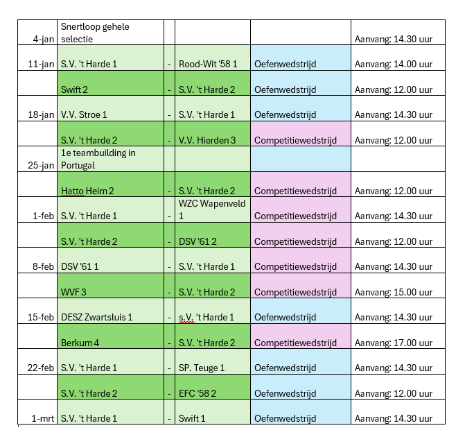 Na de feestdagen begint de selectie weer met volle moed aan de 2e seizoenshelft. Het eerste elftal speelt mee om de bovenste plaatsen en het 2e elftal draait lekker mee in de middenmoot. De trainingen worden weer hervat en de eerste oefenwedstrijden staan ingepland. Onderstaand een overzicht van de wedstrijden van het 1e en 2e elftal voor de komende weken: