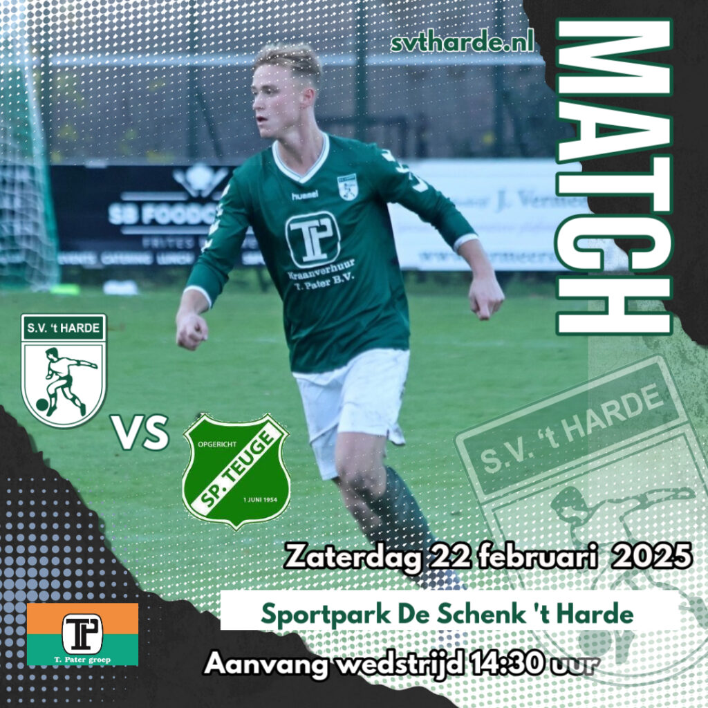 Zaterdag 22 februari speelt het eerste elftal van S.V. ’t Harde een oefenwedstrijd tegen Sportclub Teuge. De wedstrijd biedt de selectie van SV Harde een mooie gelegenheid om in vorm te blijven en zich voor te bereiden op de lopende competitie.