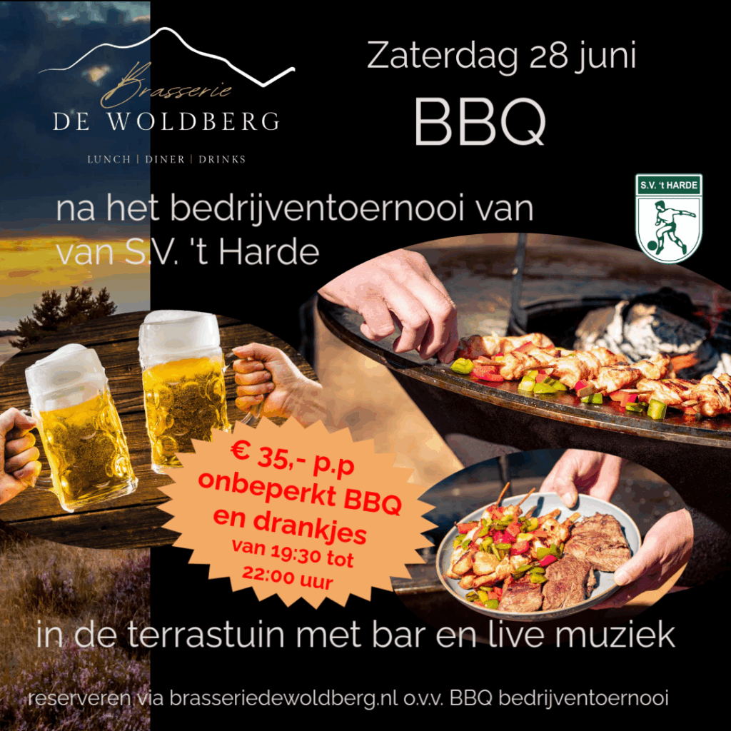 Na het toernooi nog lekker uit eten? Reserveer dan tijdig (voor jouw team) bij Brasserie de Woldberg aan de Eperweg, voor de all-inn “BBQ” ! Voor €35 p.p. maak je gebruik van een heerlijk BBQ inclusief drankjes en live muziek in de terrastuin!. Reserveren kan via de website www.brasseriedewoldberg.nl (onder vermelding van BBQ bedrijventoernooi) of door te bellen met 0525 654 061
