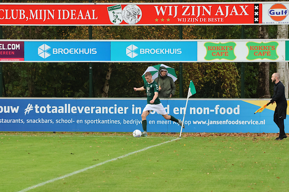 Op het hoofdveld van sportpark Schenk werd zaterdagmiddag onder herfstachtige omstandigheden de wedstrijd tussen S.V. ’t Harde en Hatto Heim gespeeld. Ondanks de regen voorafgaand aan het duel, werd er gewoon op natuurgras gespeeld. Juist op dit soort velden ontstaan vaak de mooiste duels, waar strijd en techniek samen moeten komen. Dat was ook deze middag het geval.