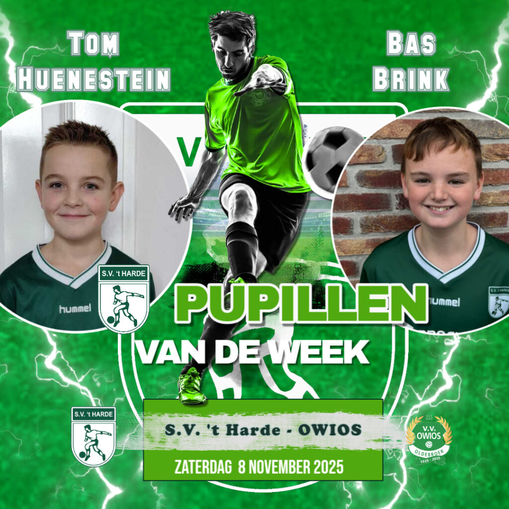 Zaterdag 8 november speelt S.V. ‘t Harde op sportpark Schenk zijn volgende competitie-wedstrijd thuis tegen OWIOS. Gedurende deze dag zullen Tom Huenestein en Bas Brink aanwezig zijn als Pupillen van de week.