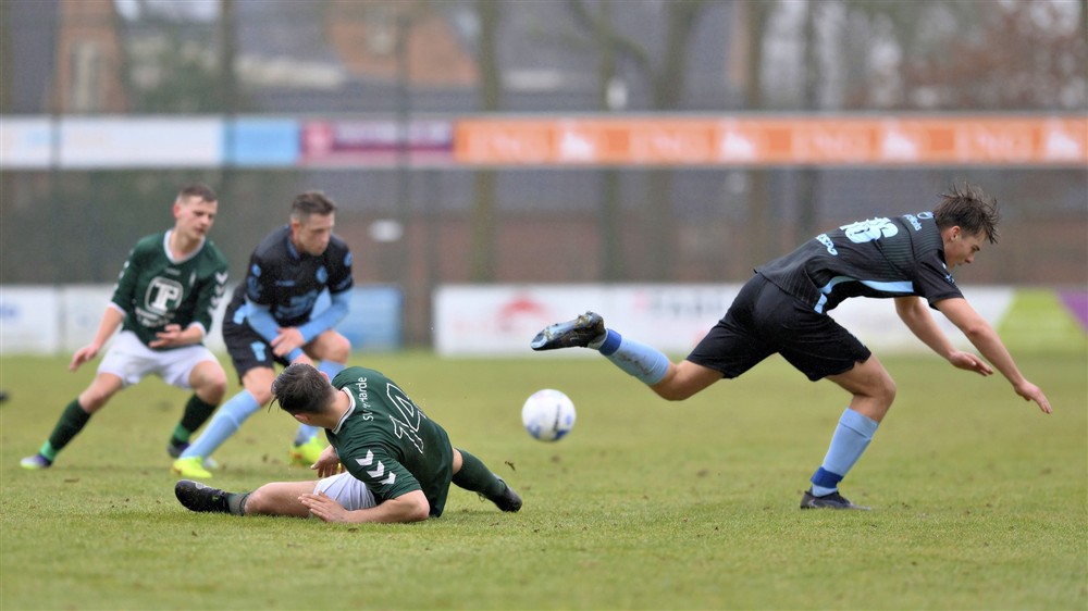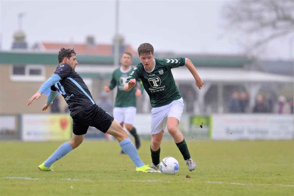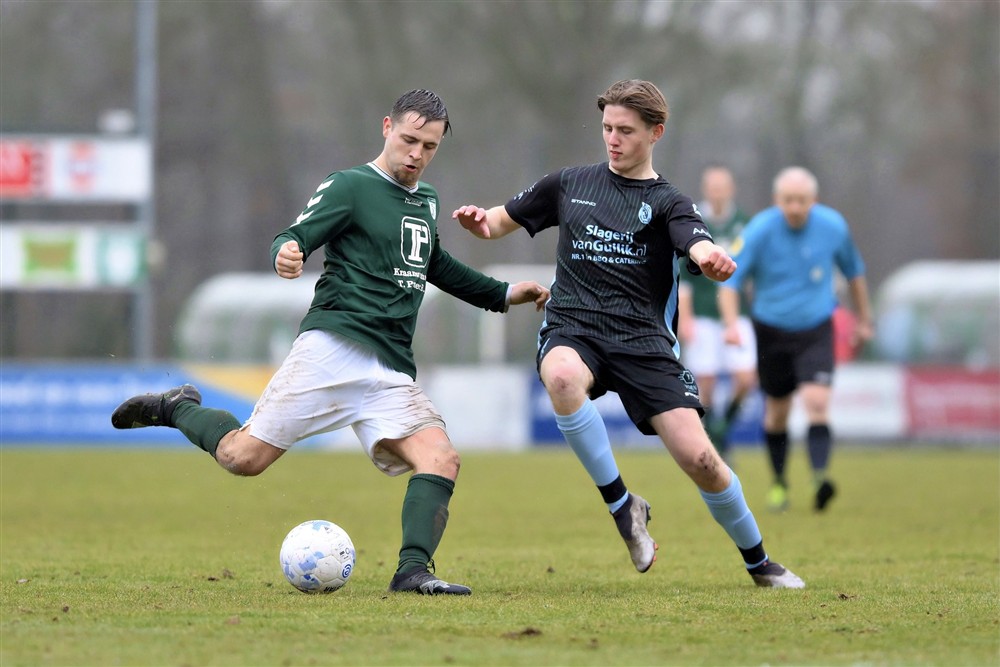 Het spelbeeld bleef in de rest van de eerste helft hetzelfde. S.V. ’t Harde zocht de aanval, maar deed dat in een te laag tempo en was bij balverlies kwetsbaar. Vlak voor rust werd dat opnieuw afgestraft. Na simpel balverlies op het middenveld en matig verdedigen rondde Thomas Timmerman fraai af met een stift van zo’n twintig meter: 0-2.