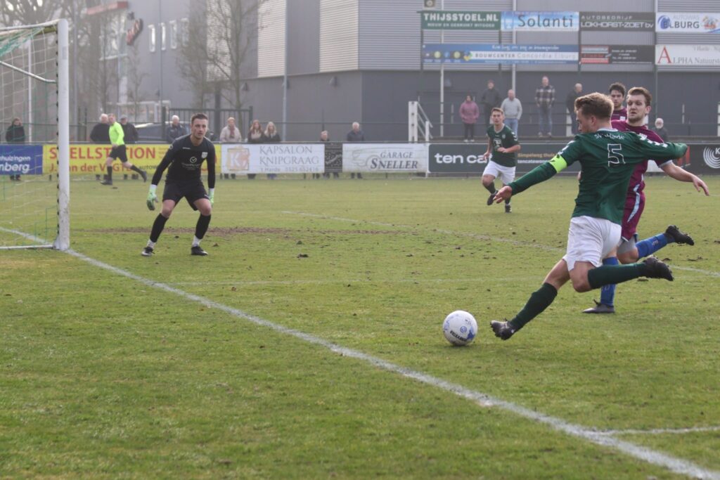 Binnen tien minuten kwam de thuisploeg op voorsprong. Een prachtige aanval werd opgezet door aanvoerder Bram van de Worp, die vanaf het middenveld Hielke van Schoten op de rechterflank bediende. De voorzet van Van Schoten was op maat en Daan Elskamp nam de bal in één keer uit de lucht: 1-0.