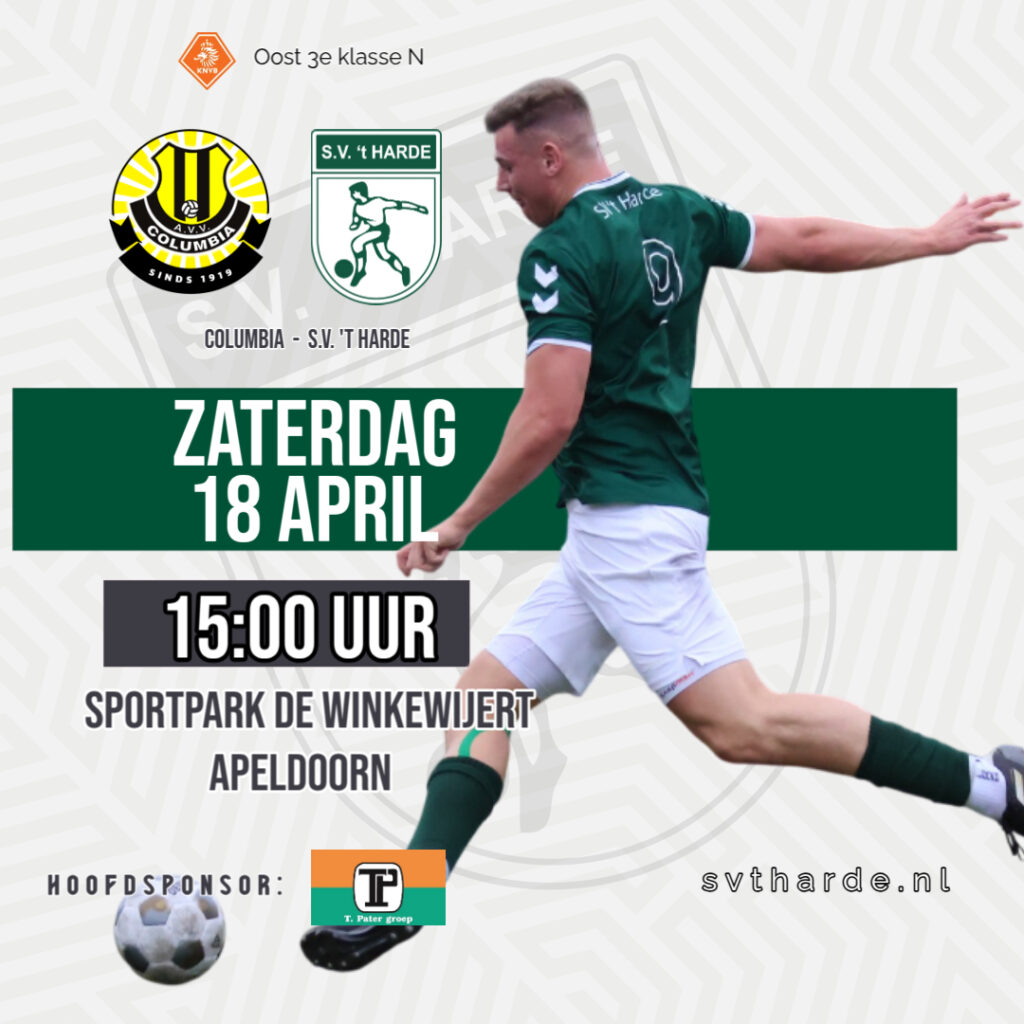 Op 22 november boekte de Sv ’t Harde een zeer ruime 5-0 thuis overwinning op de Apeldoorners. Columbia werd die week echter geteisterd door vele blessures dus het is zeker niet te verwachten dat ’t Harde een makkelijke middag wacht. Een overeenkomst tussen beide teams is wel dat er zeer wisselende resultaten worden behaald. Zo wonnen beide ploegen een wedstrijd van koploper Owios maar worden er veel punten verspeeld aan ploegen onderin de ranglijst. ’t Harde verloor thuis van Hattem terwijl Columbia uit bij de rode lantaarn AGOVV verloor. Het lijkt erop dat beide teams het lastig hebben tegen ploegen die (ver) inzakken en dan snel omschakelen.